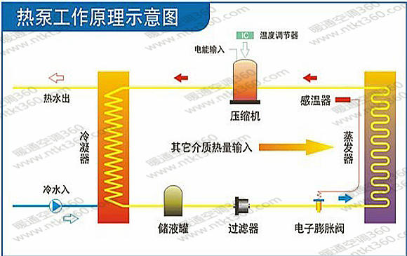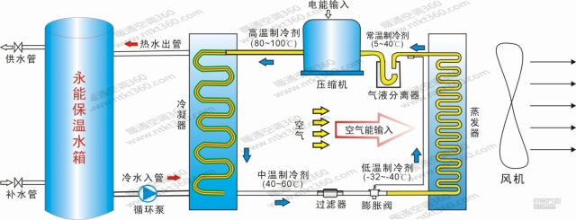 空气源热泵工作原理 空气源热泵原理就是利用逆卡诺原理,以极少的电能,吸收空气中大量的低温热能,通过压缩机的压缩变为高温热能,是一种节能高效的热泵技术。空气源热泵在运行中,蒸发器从空气中的环境热能中吸取热量以蒸发传热工质,工质蒸气经压缩机压缩后压力和温度上升,高温蒸气通过永久黏结在贮水箱外表面的特制环形管冷凝器冷凝成液体时,释放出的热量传递给了空气源热泵贮水箱中的水,冷凝后的传热工质通过膨胀阀返回到蒸发器,然后再被蒸发,如此循环往复。